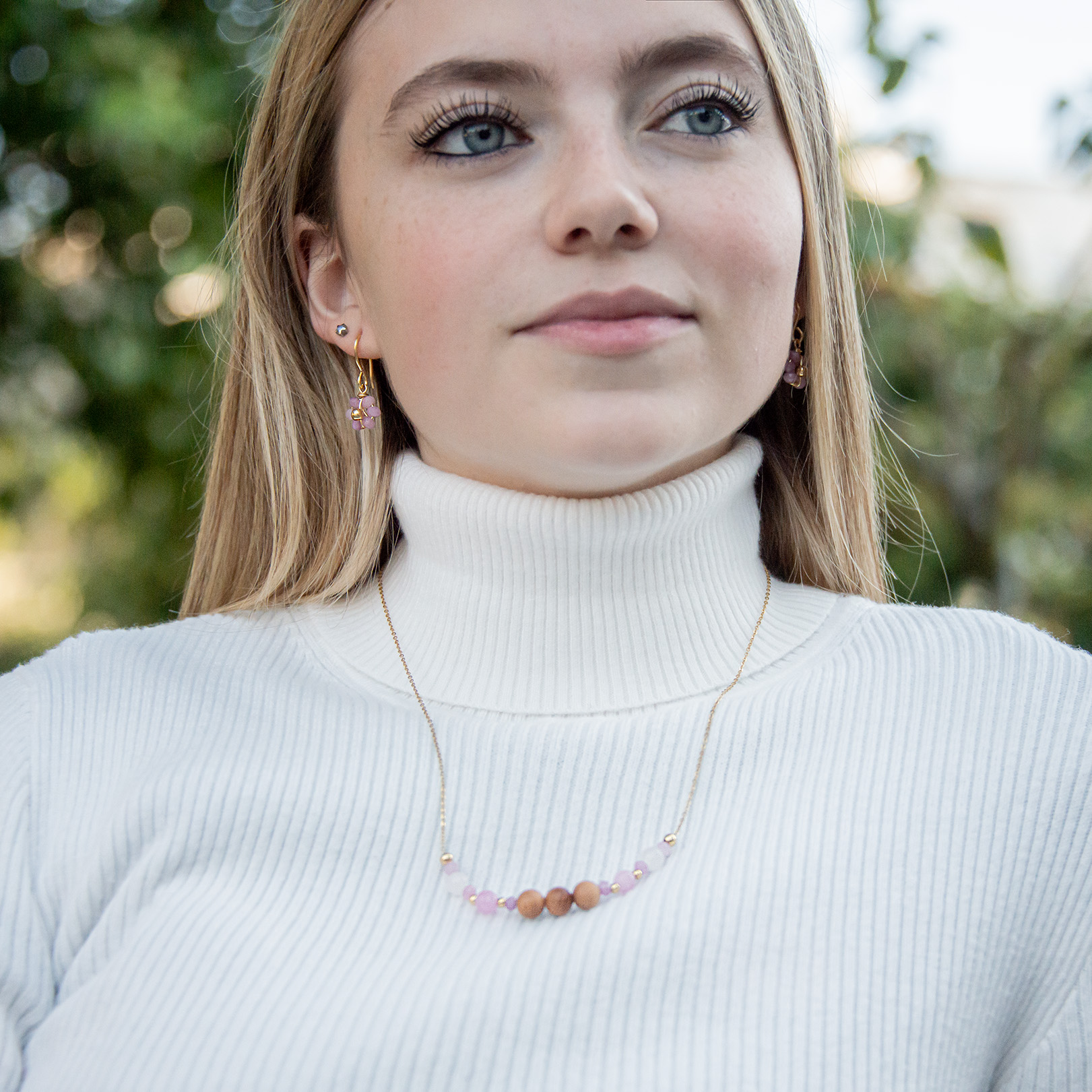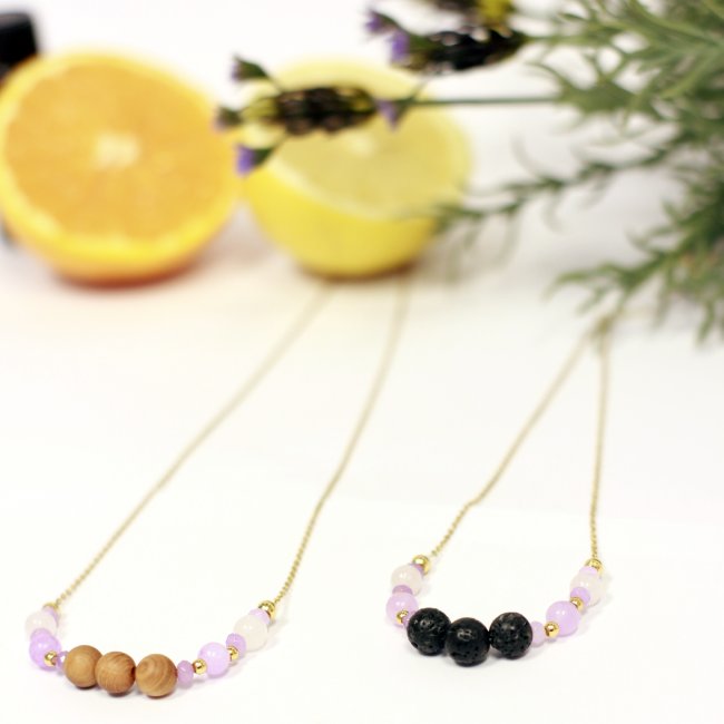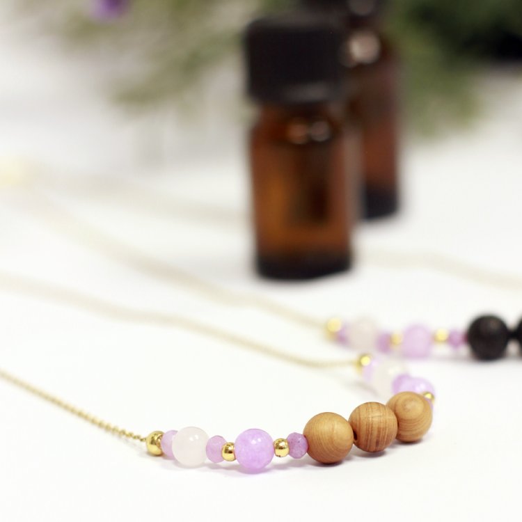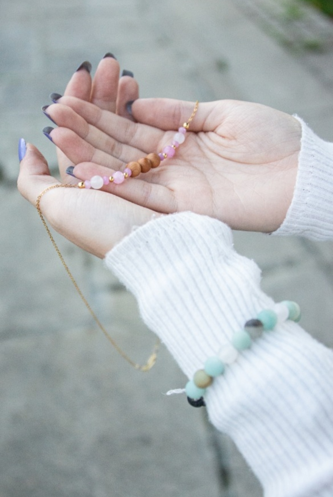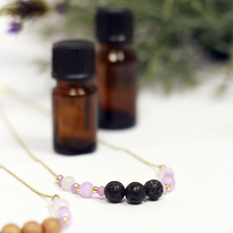COLLAR DIFUSOR DE ACEITES, HECHO A MANO CON CADENA DE ACERO INOXIDABLE, PIEDRAS NATURALES DE CUARZO ROSA, JADE, BALINES DE ACERO Y MADERA O LAVA VOLCANICA NEGRA.