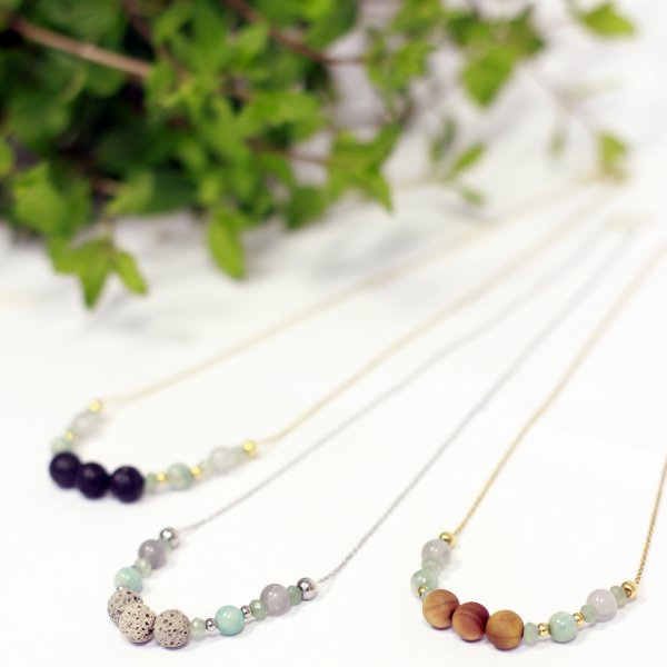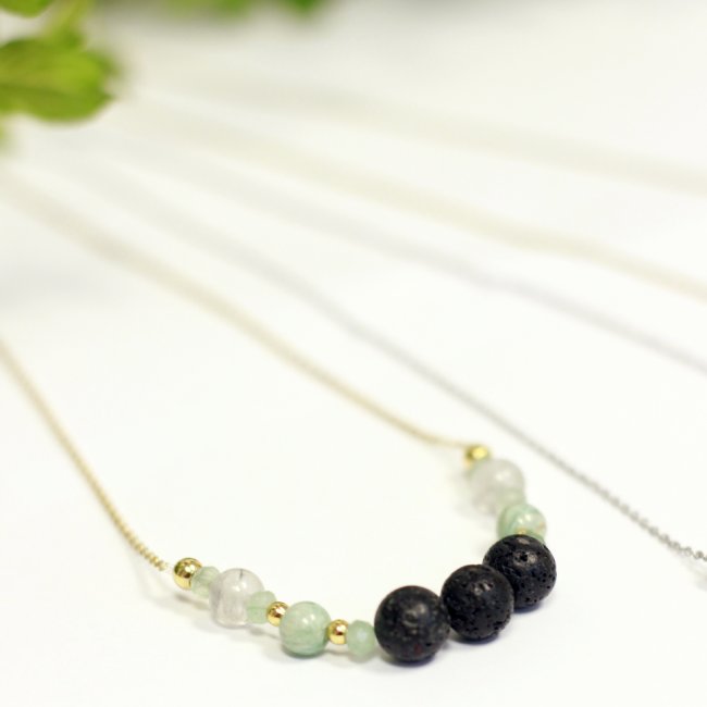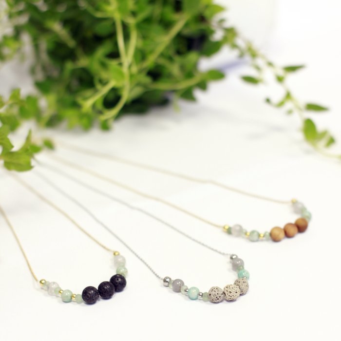 COLLAR DIFUSOR DE ACEITES; HECHO A MANO CON CADENA DE ACERO INOXIDABLE, PIEDRAS NATURALES DE AMAZONITA, CUARZO GRIS, JADE, BOLAS DE ACERO Y MADERA O LAVA VOLCANICA NEGRA O GRIS.