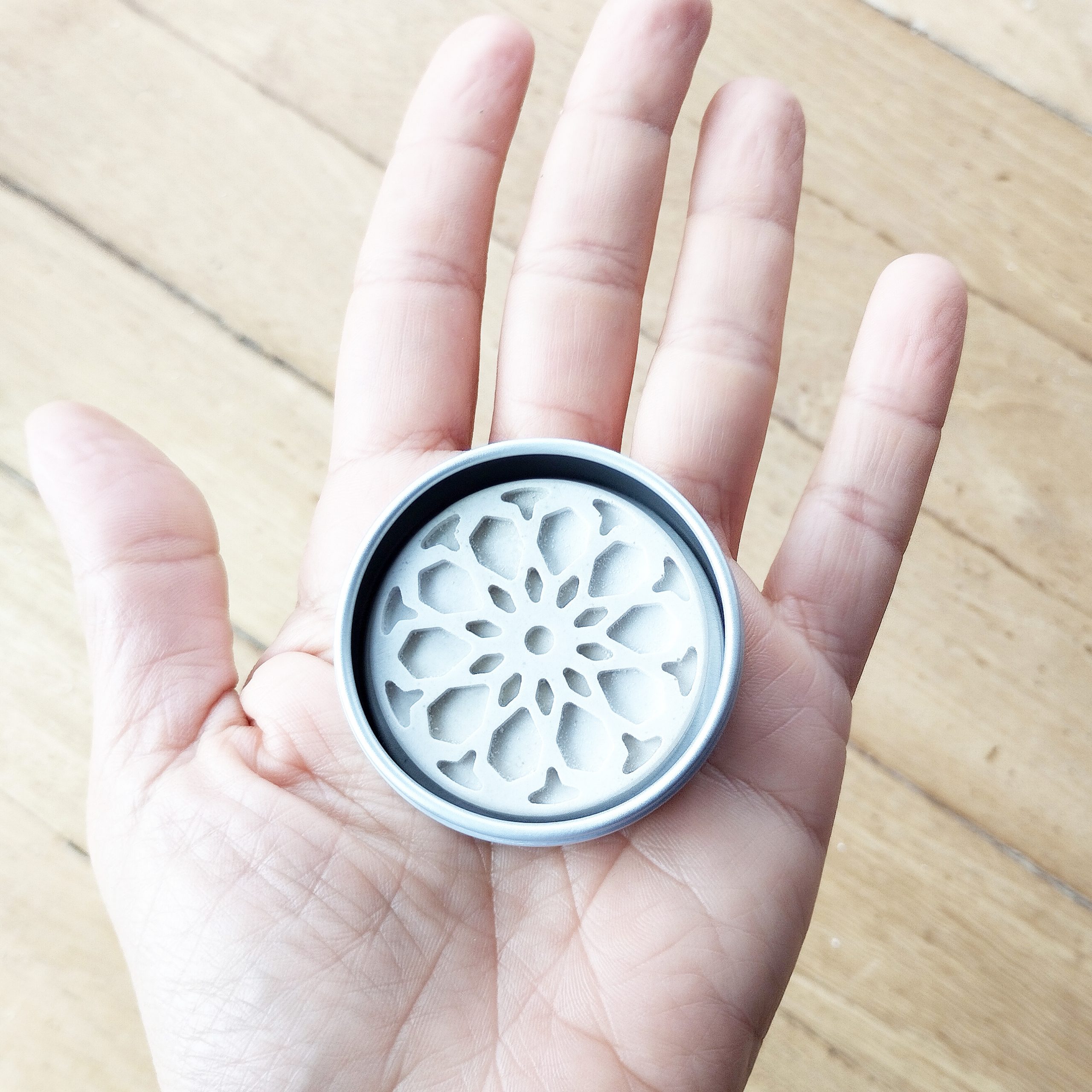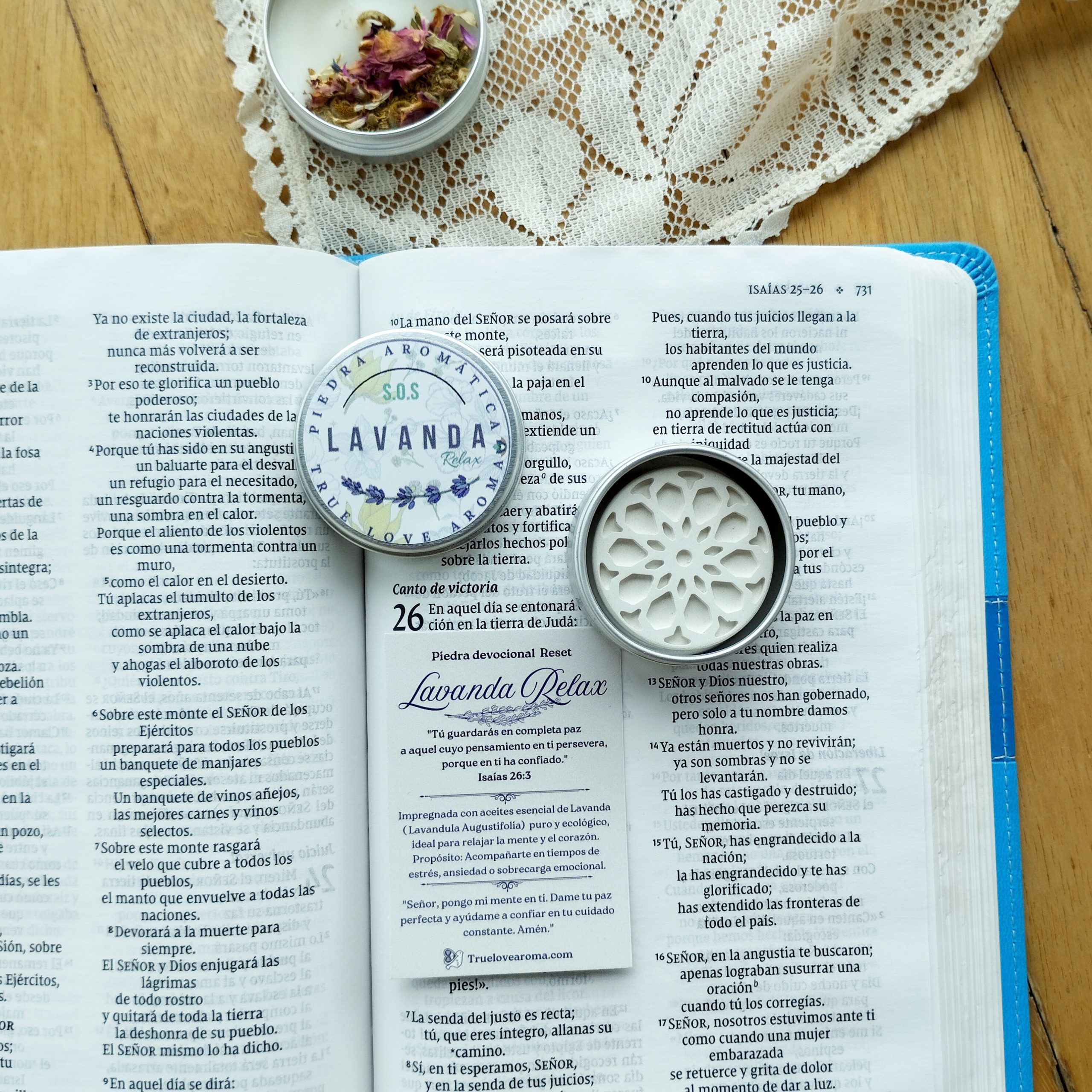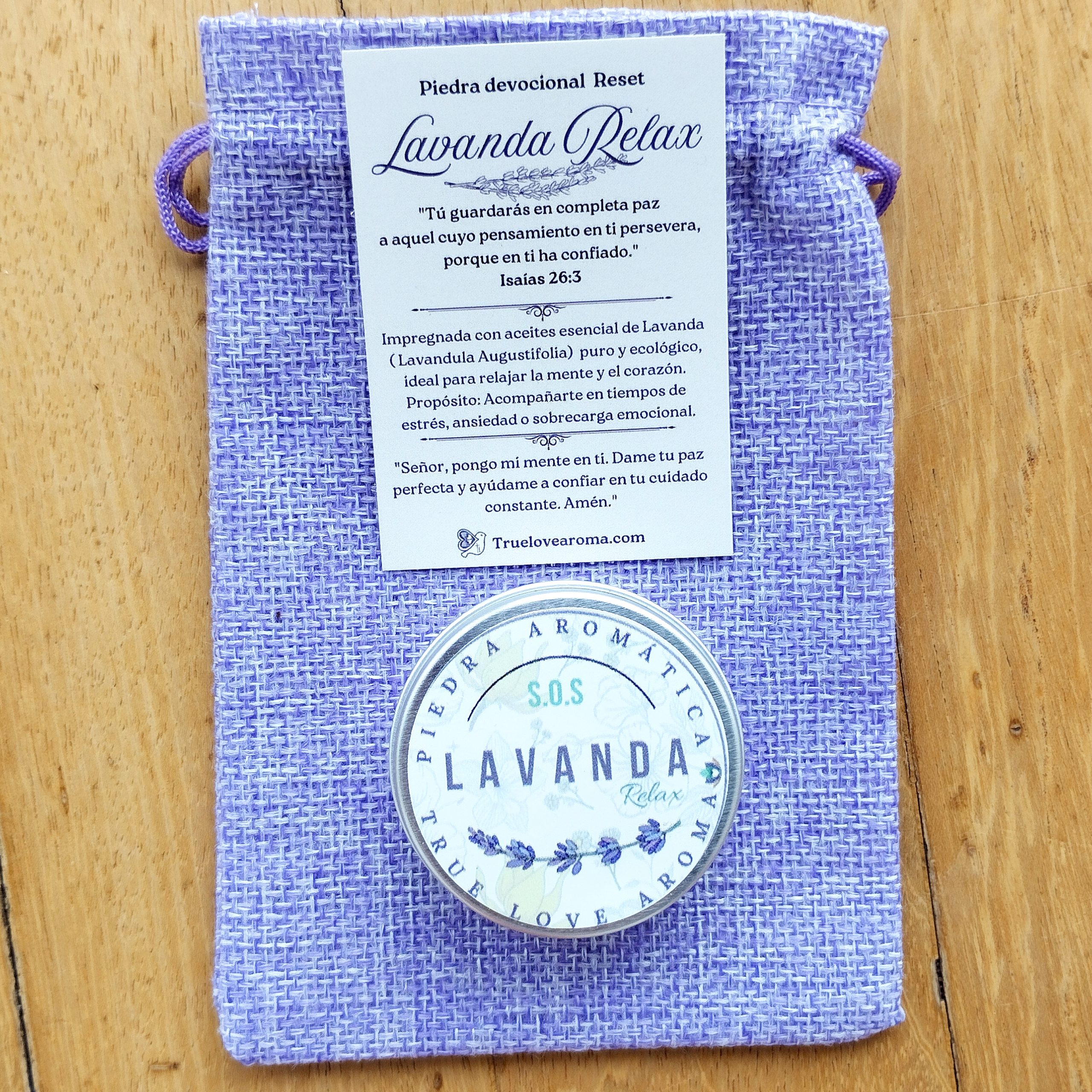 Piedra devocional cerámica impregnada con aceite esencial puro y ecológico de Lavanda. El aceite esencial de Lavanda es reconocido a nivel mundial por sus propiedades calmantes y relajantes, actuando como un ansiolítico natural para los momentos de tensión, estrés y ansiedad. Abre el envase y respira profundo el aroma del aceite varias veces, luego cierra el envase para mantener el aroma en la piedra. Te ayuda a soltar y a confiar en la perfecta paz de Dios.