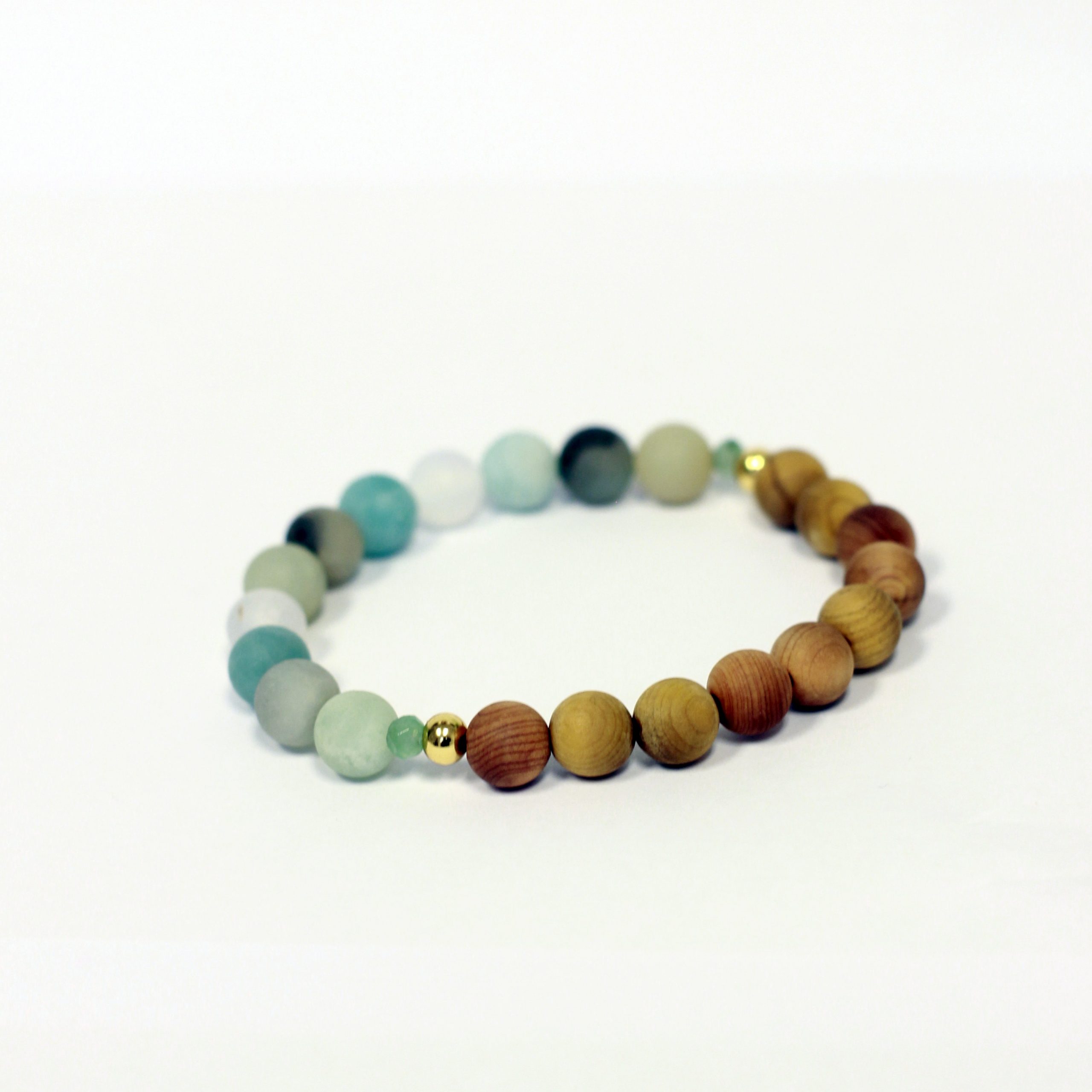 PULSERA HECHA A MANO CON PIEDRAS NATURALES DE AMAZONITA, AGATA, JADE, BALINES DE ACERO Y MADERA O LAVA VOLCANICA NEGRA.