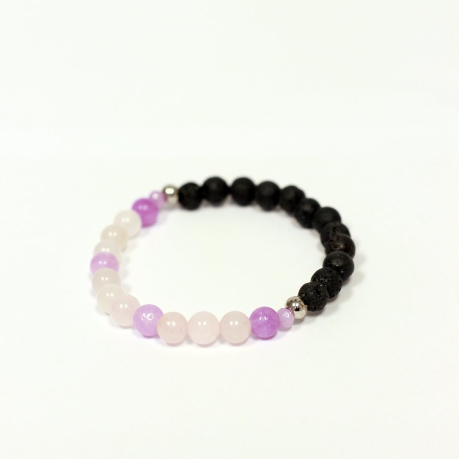 PULSERA ELABORADA CON CUARZO ROSA, JADE, BALINES DE ACERO Y MADERA O LAVA VOLACANICA NEGRA.