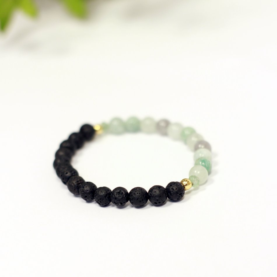 PULSERA DIFUSORA DE ACEITE, HECHA A MANO ELABORADA CON PIEDRAS NATURALES DE CUARZO GRIS, JADE, AMAZONITA, BALINES DE ACERO Y MADERA O LAVA VOLCANICA NEGRA.