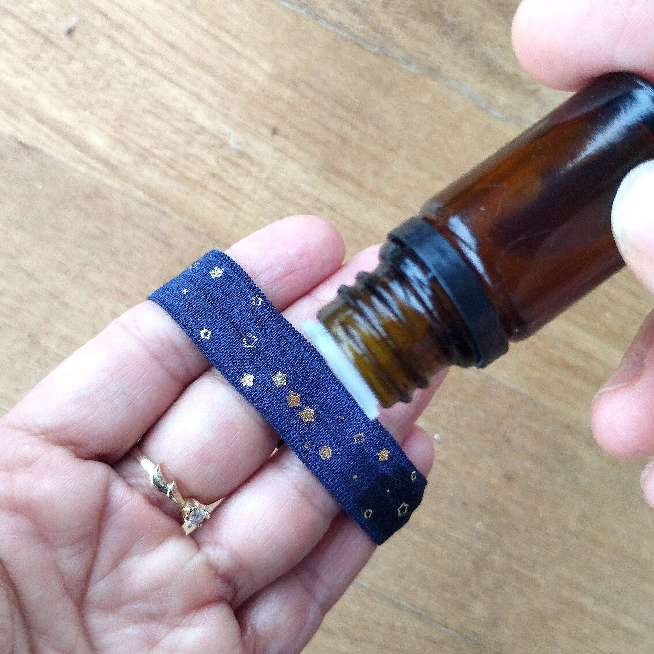 Cada noche agrega dos gotas de algún aceite esencial que ayude a promover el sueño como el de Lavanda, Naranja, Vetiver o el que sea de tu agrado. colócala en tu muñeca y ajústala a la medida que no quede holgada pero tampoco apretada.